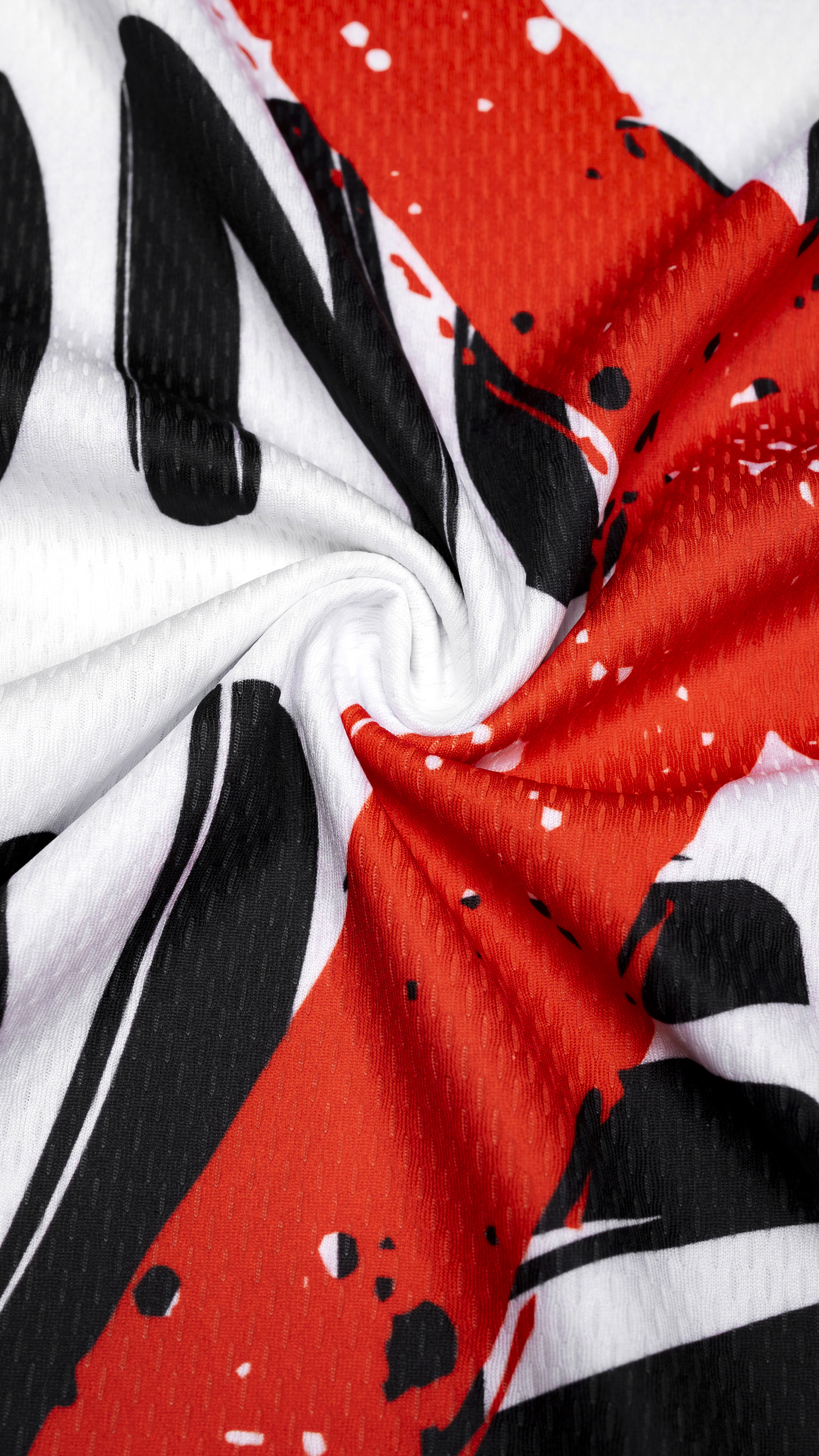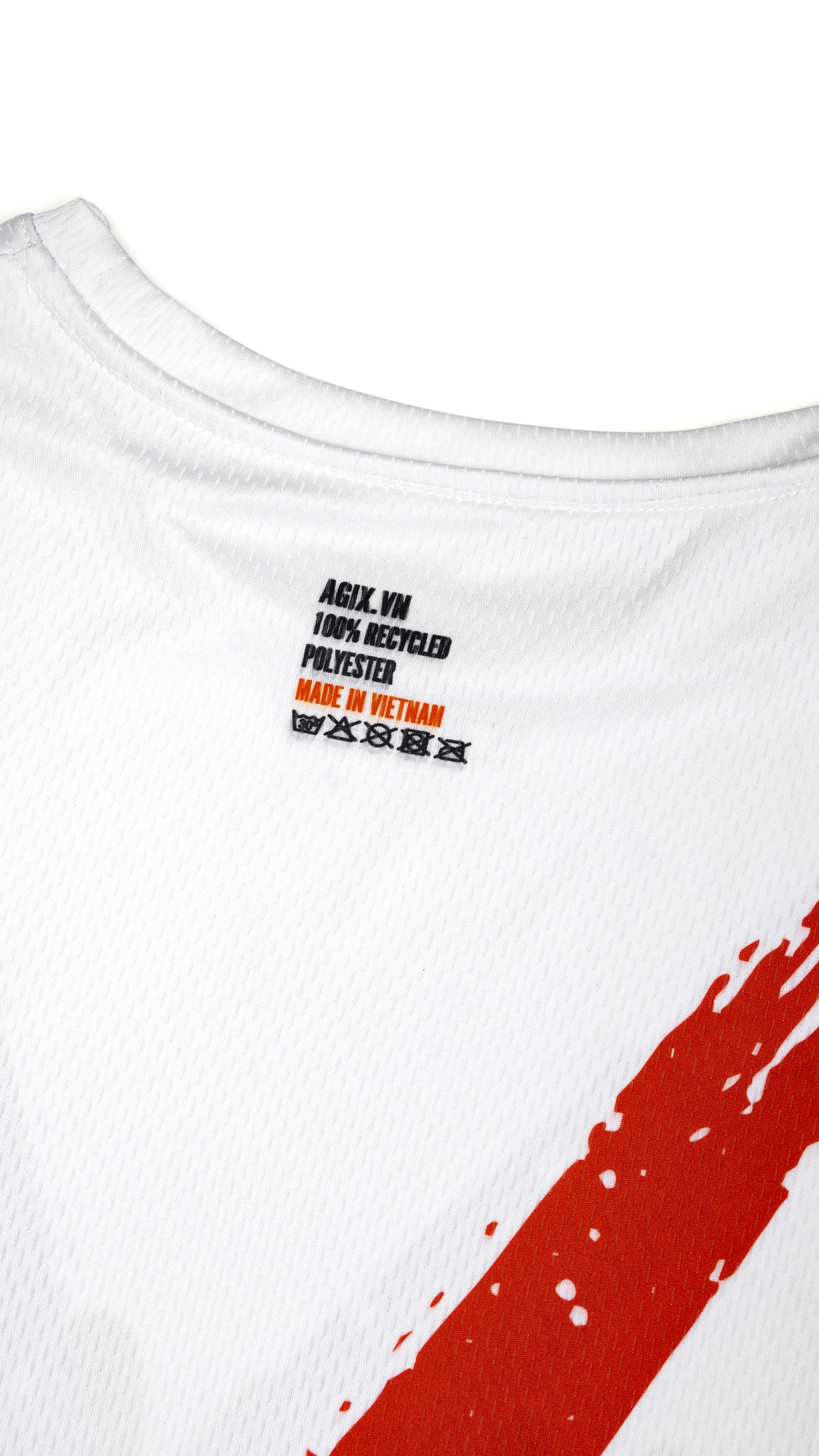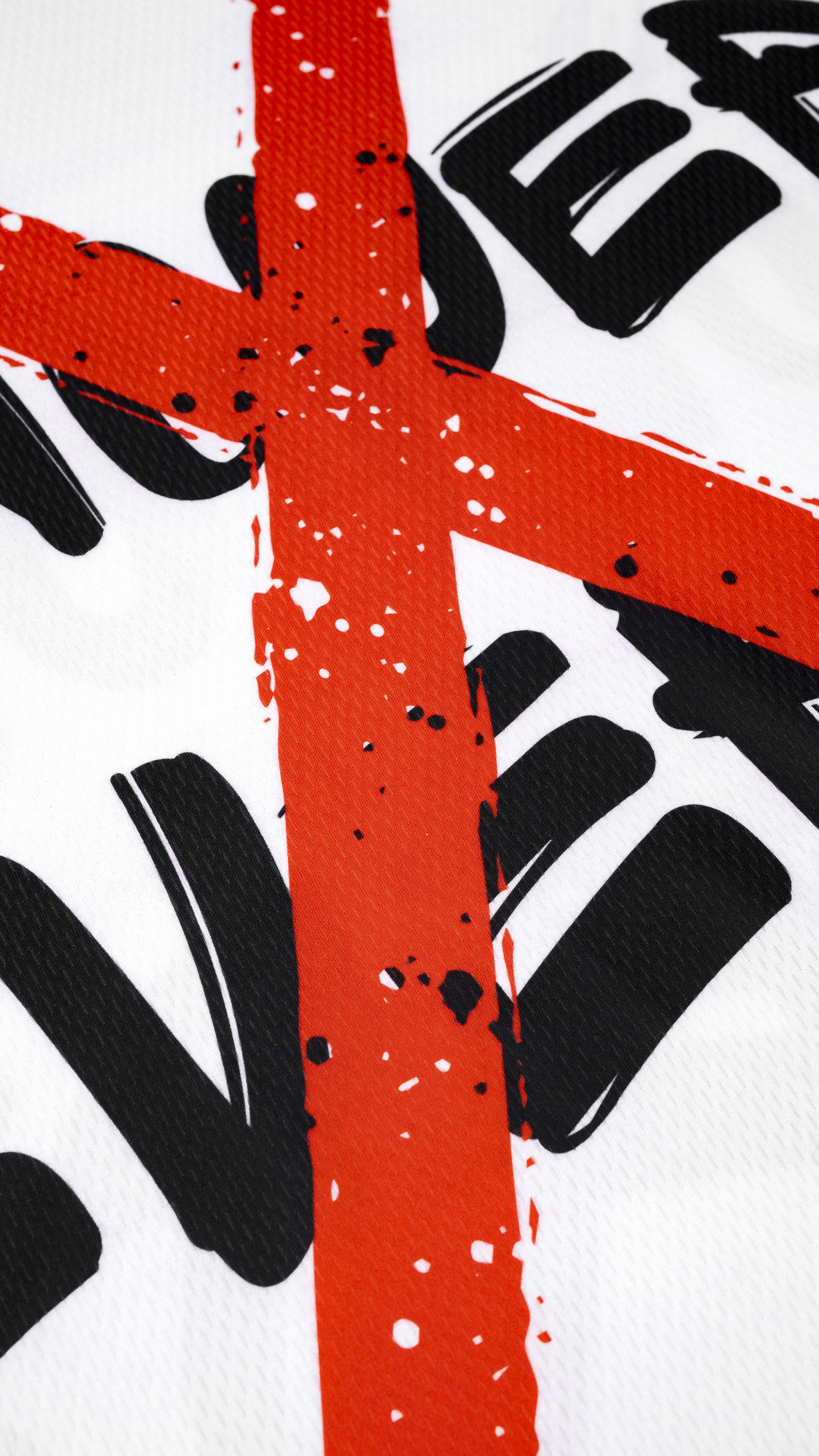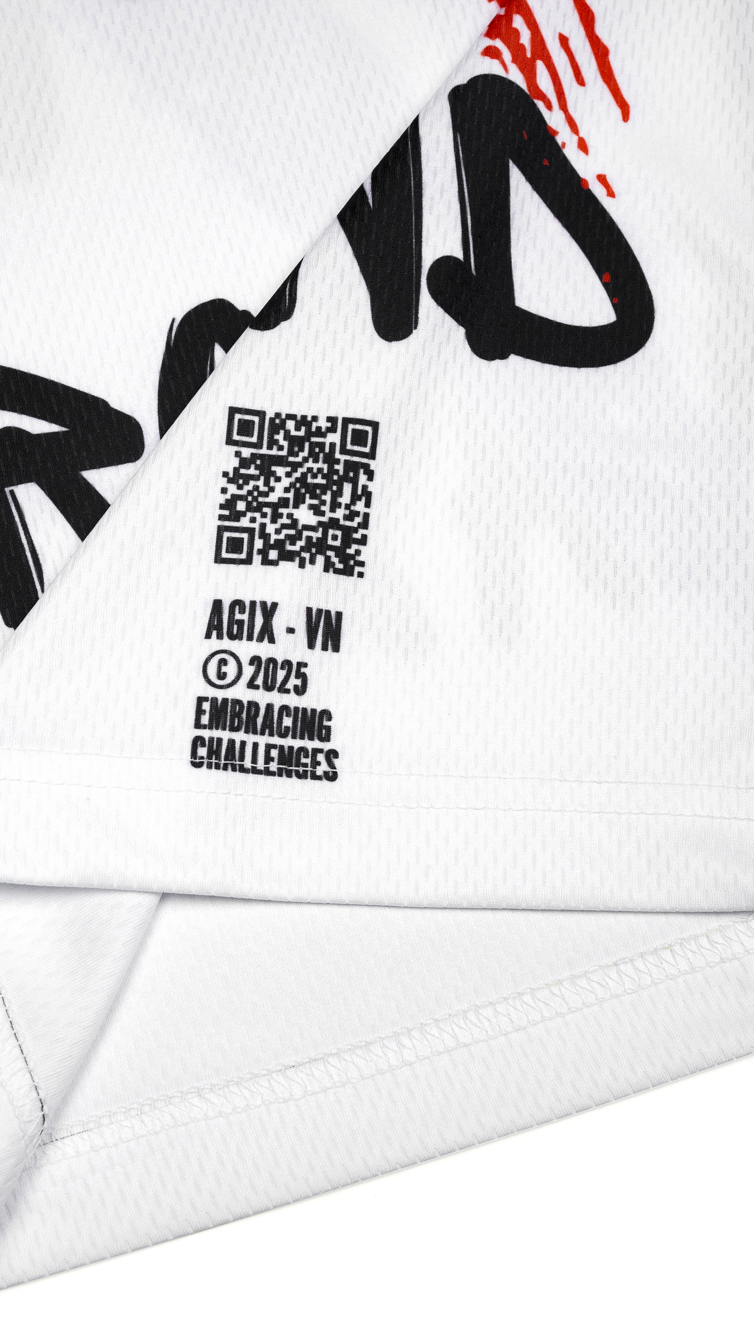 Thiết kế phá cách với dấu “X” đỏ máu trải dài từ áo xuống quần – như một cú đánh mạnh vào mọi rào cản. Phông chữ graffiti ngổ ngáo cùng mảng đối lập trắng – đen đầy kịch tính tạo nên tổng thể đậm chất “street warrior”.
