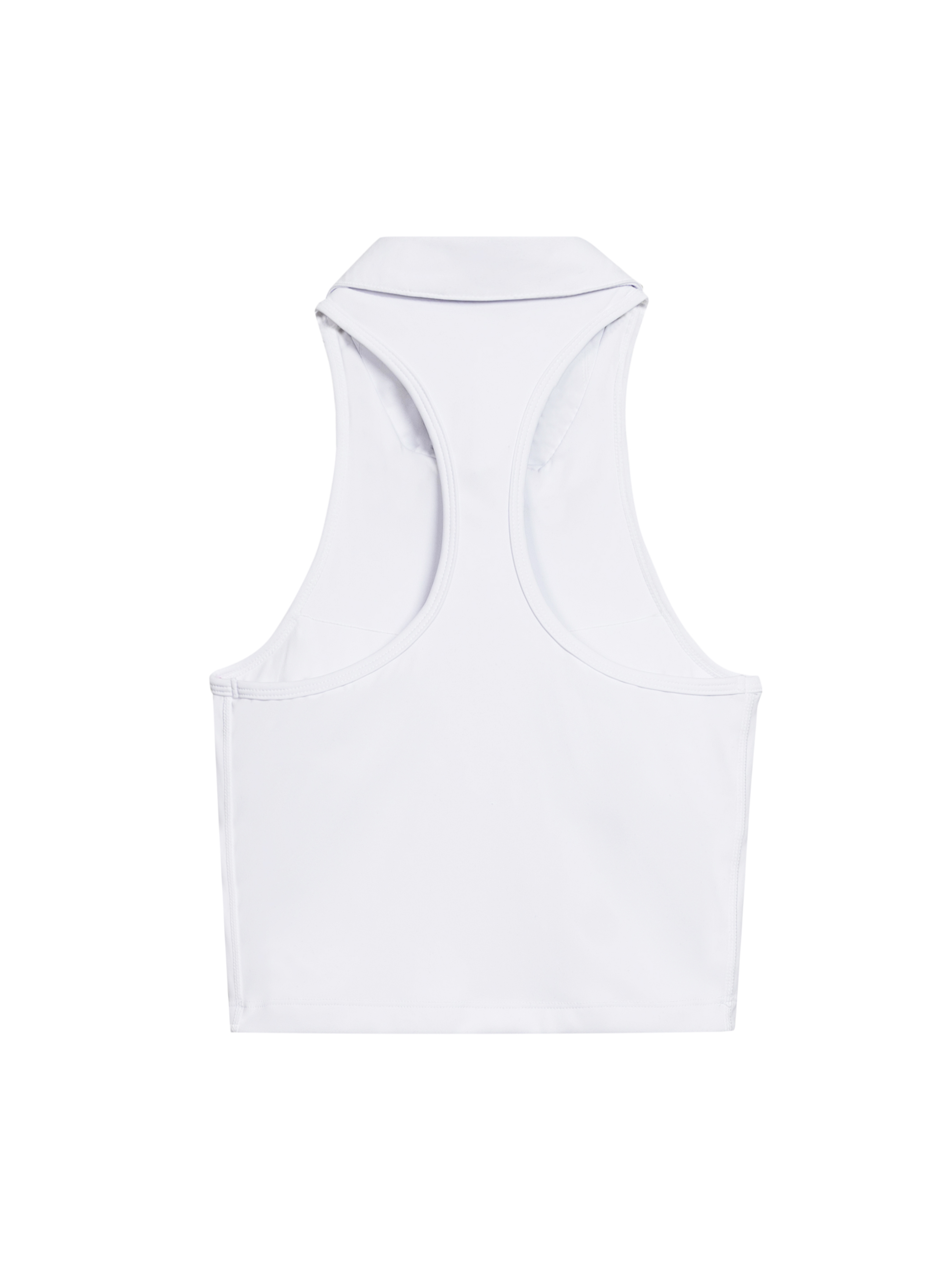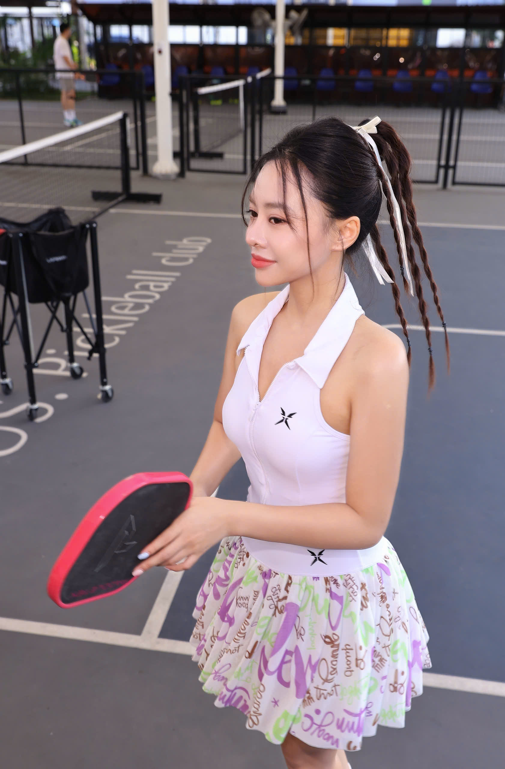 Áo croptop cổ vest trắng tối giản, ôm dáng gọn gàng, kết hợp chân váy xếp ly, tạo nên sự cân bằng hoàn hảo giữa mạnh mẽ và nữ tính.