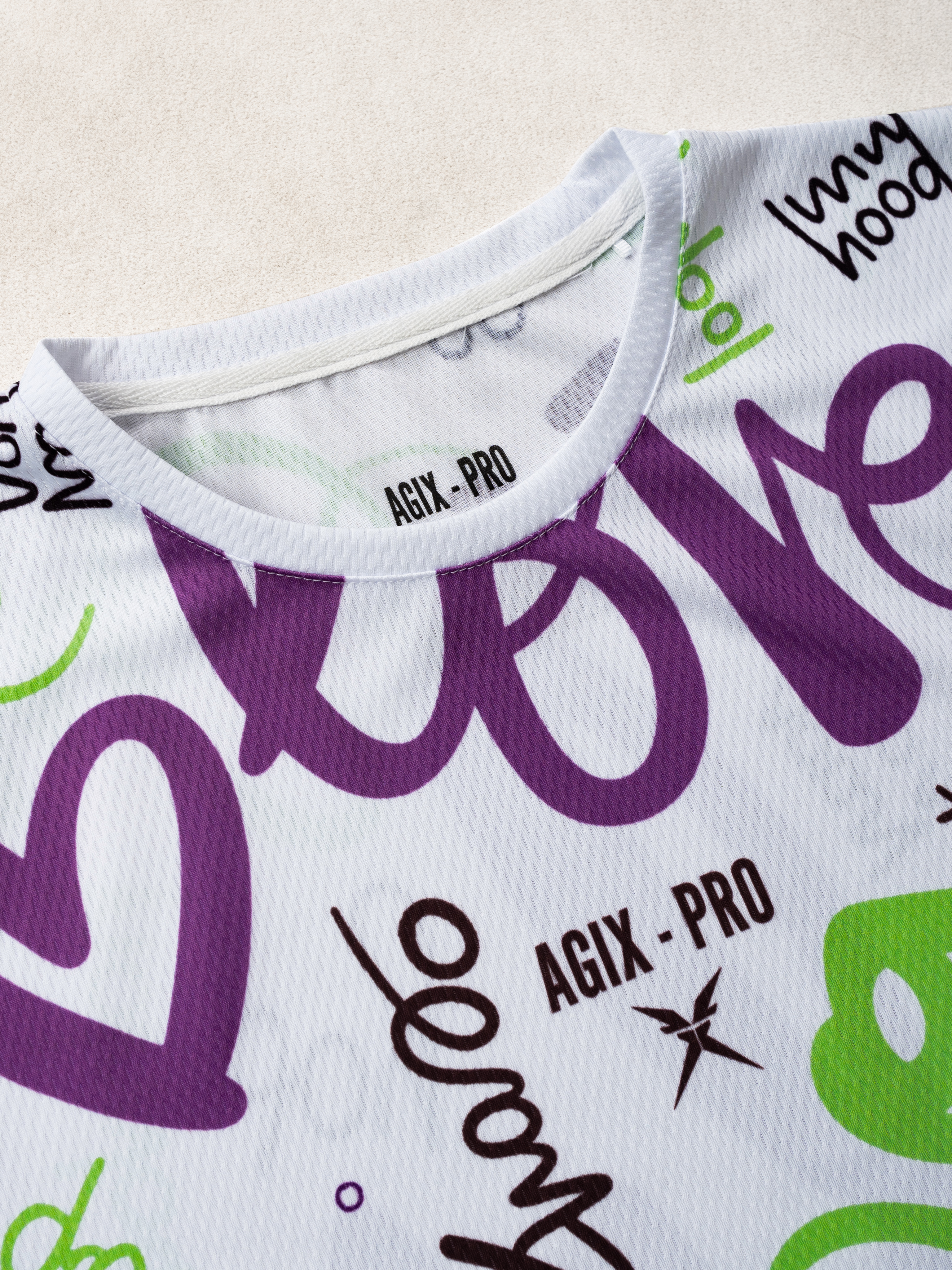 Lấy cảm hứng từ nghệ thuật graffiti và những thông điệp tích cực, bộ đồ POSITIVE VIBES biến từng dòng chữ thành nguồn cảm hứng sống động. Các từ khoá như love, good, happiness… được thể hiện bằng font chữ đa dạng, màu sắc ngẫu hứng, mang lại cảm giác phóng khoáng, trẻ trung và cực chất.