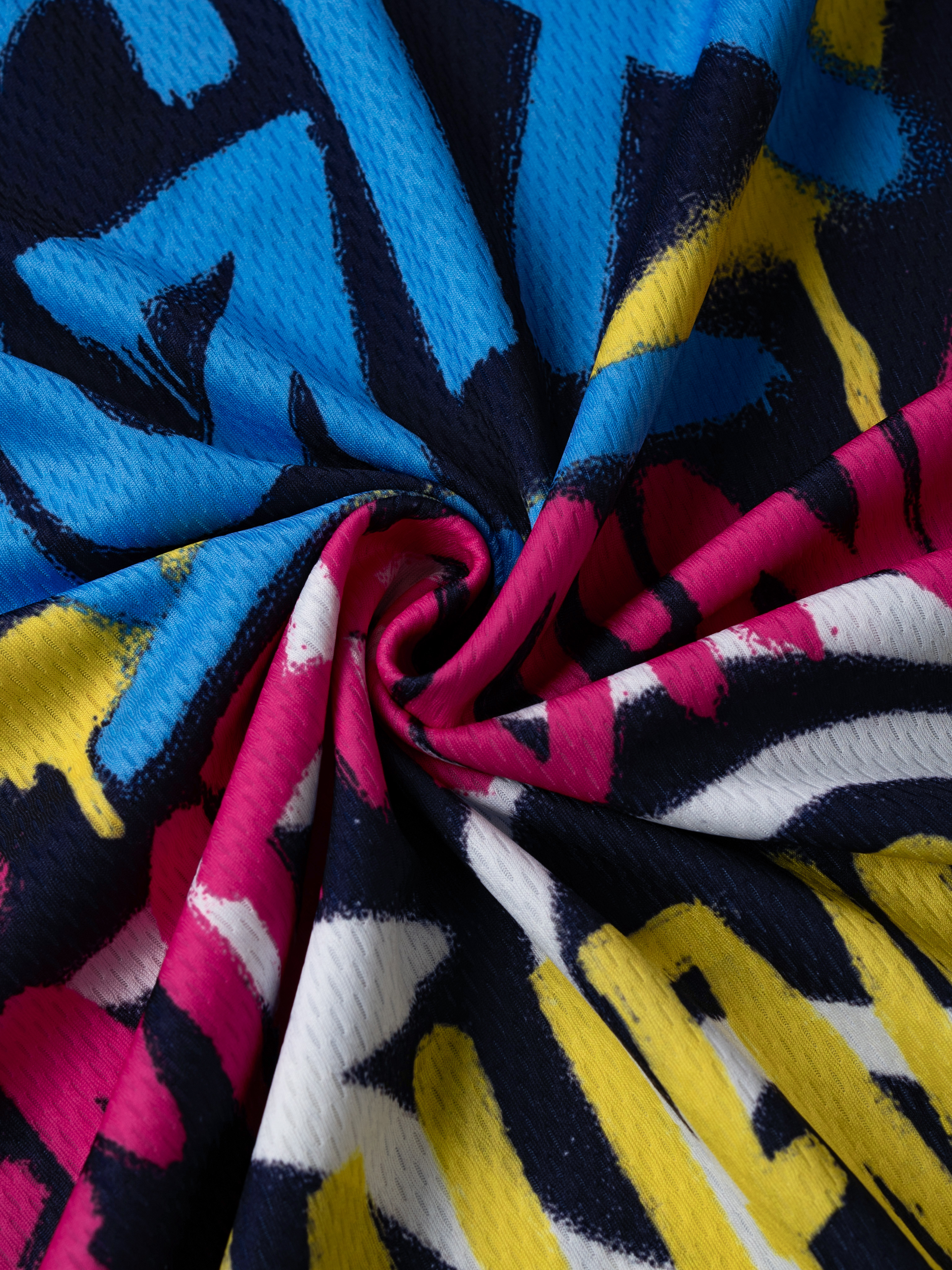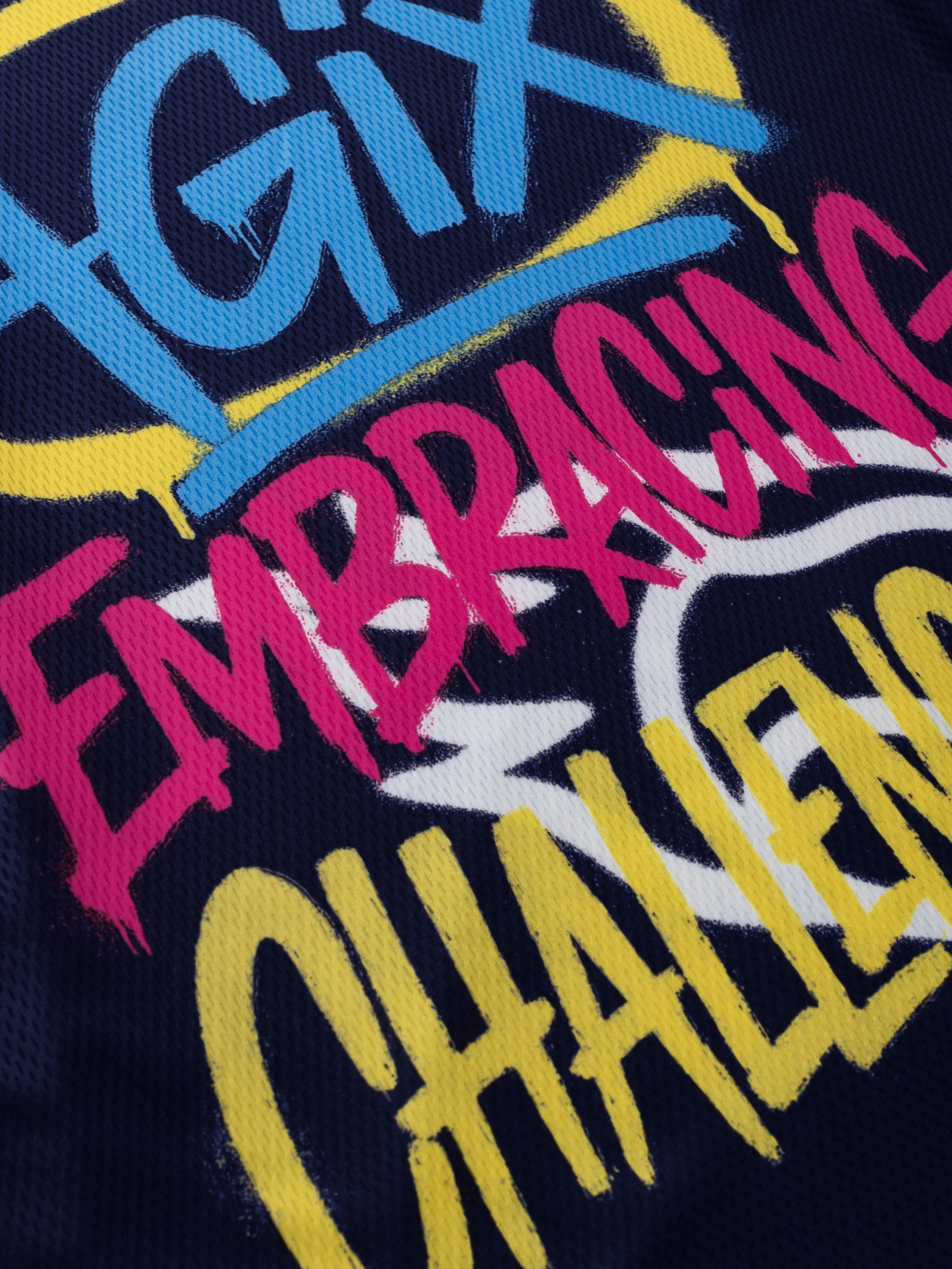 Lấy cảm hứng từ nghệ thuật graffiti phóng khoáng, bộ đồ STREET BLAZE mang đến tinh thần nổi loạn và dám khác biệt. Các dòng chữ spray-paint với hiệu ứng loang chảy, kết hợp sắc neon xanh – vàng – hồng tạo nên cảm giác bùng nổ như những mảng màu bắn tung trên bức tường phố.