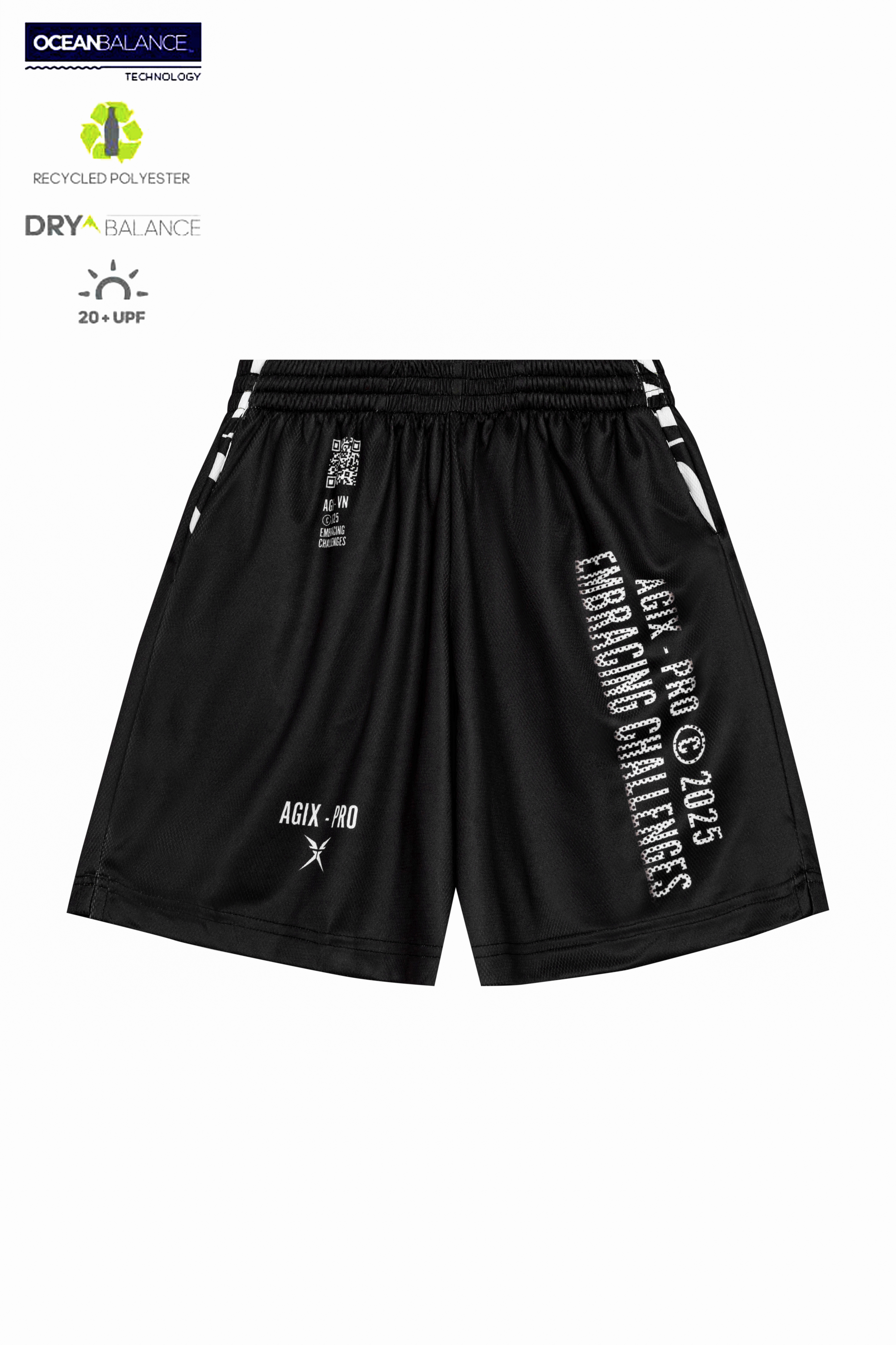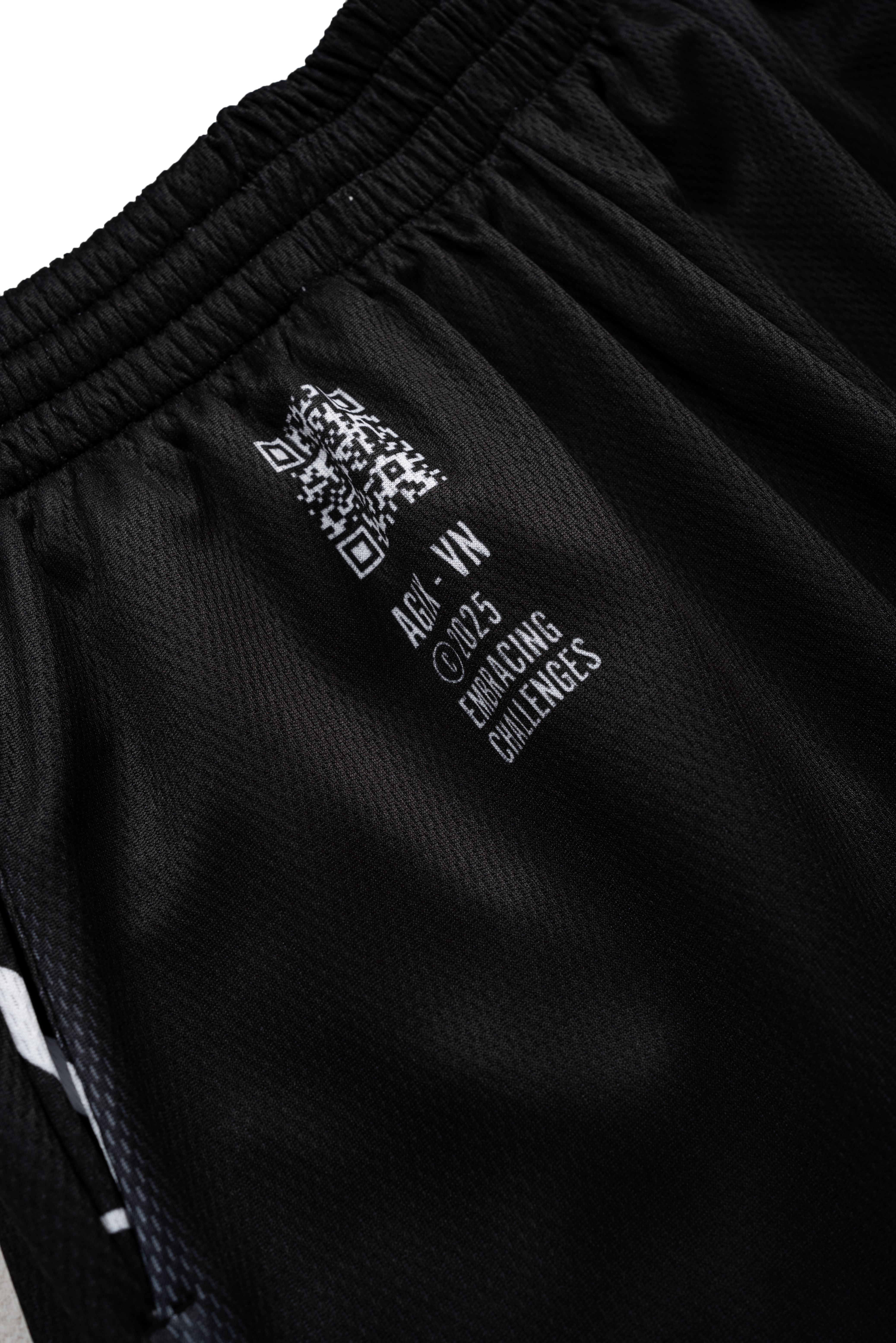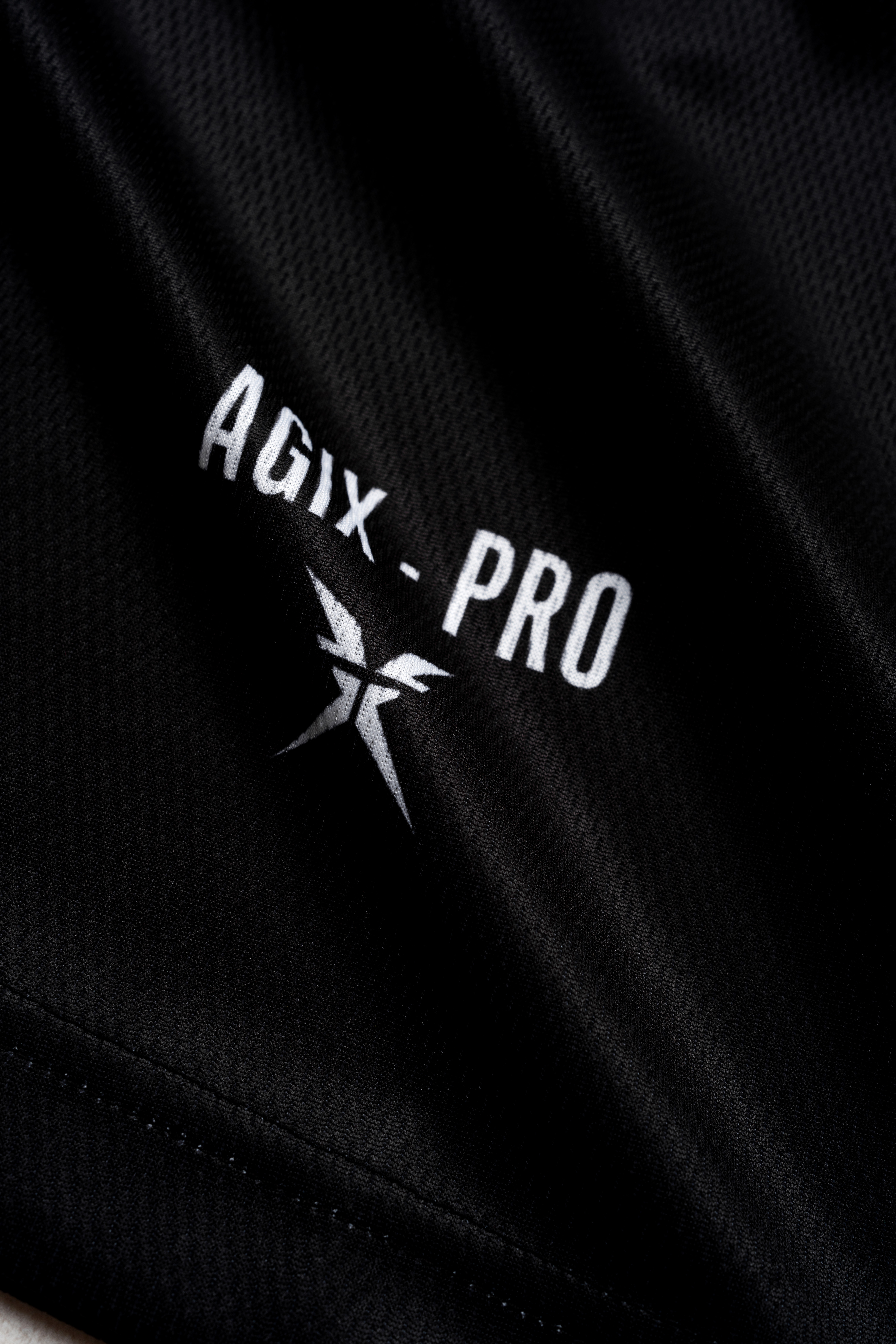 Phần thân áo phủ toàn bộ họa tiết vằn bản lớn, gợi cảm giác chuyển động liên tục và sức mạnh bứt phá. Quần short phối đen tối giản, nhấn bằng typography AGIX-PRO bản lớn đặt chéo – tăng độ cá tính và nổi bật.